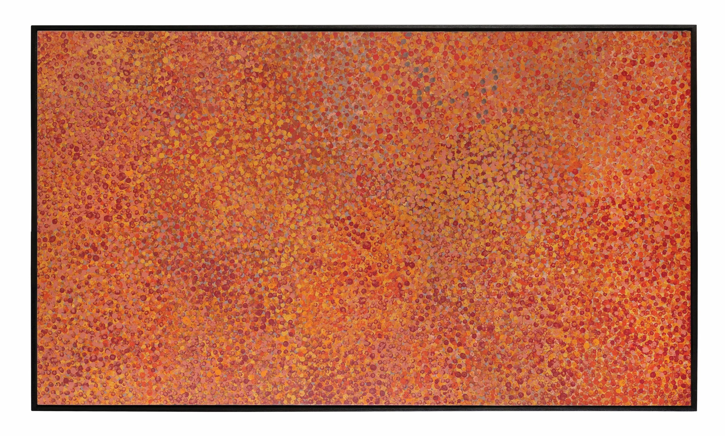 In this sense the ceremony is central to Kngwarray’s work. Paintings are not objects, but expressions of practice. They are an extension of the Country, the ancestors, life defined by connections and custodianship. Practice and ceremony that are ways of being. The artist does not represent her Dreaming. She is her Dreaming. Painting gestures toward the ongoing and reciprocal relationship with the ancestors and the Dreaming, from one generation to the rest.