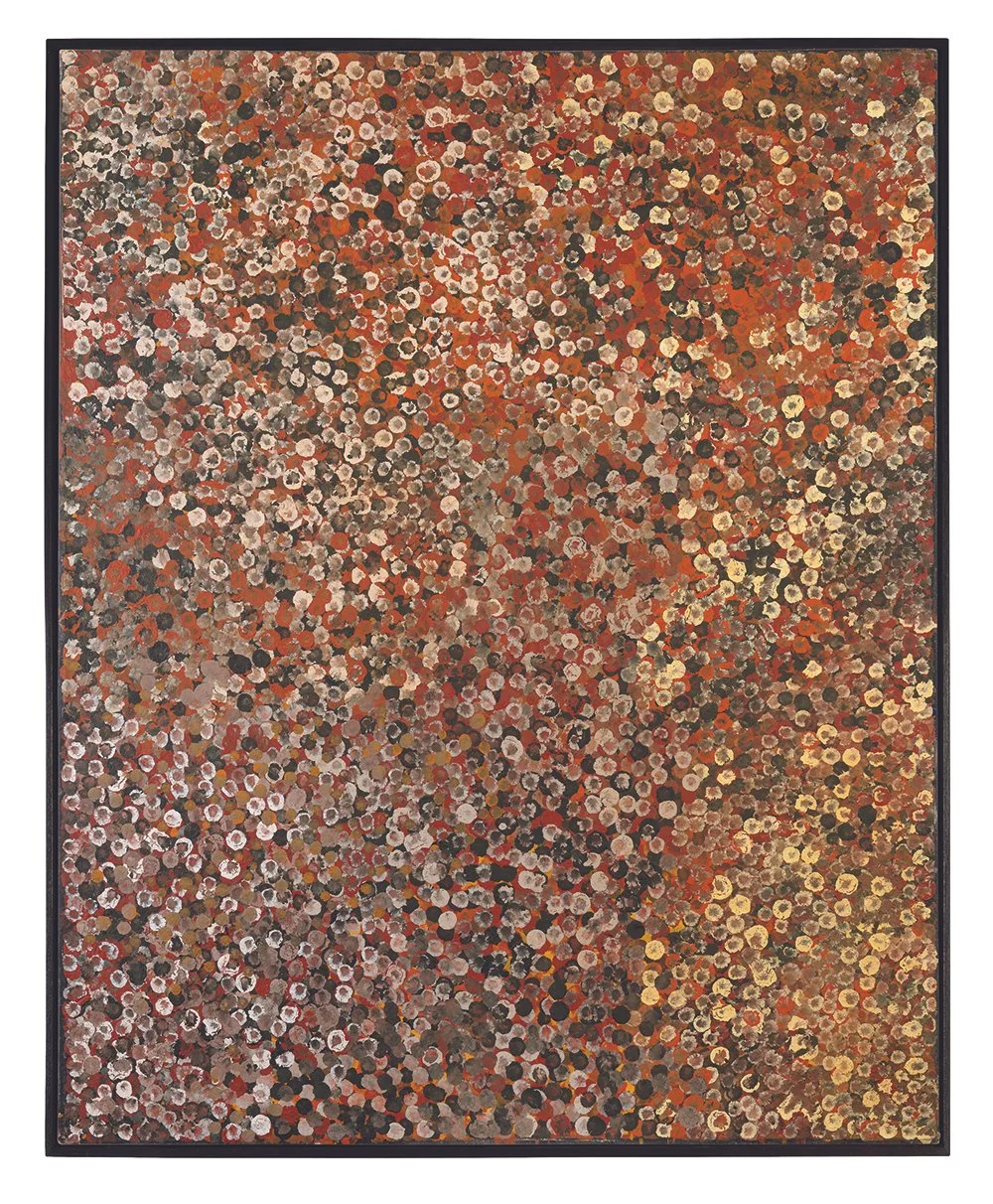 “The rhythmic beating of the brush, dots penetrating the ground underneath the canvas is a vital component in communicating the aliveness of Dreaming. As a keeper of ancestral knowledge, Emily had both a reverence for ceremony and devotional touch that she attained and imparted throughout her life. This became integral in her painting practice, with the rituals and repetitions of her culture being imprinted on her canvases.” 5